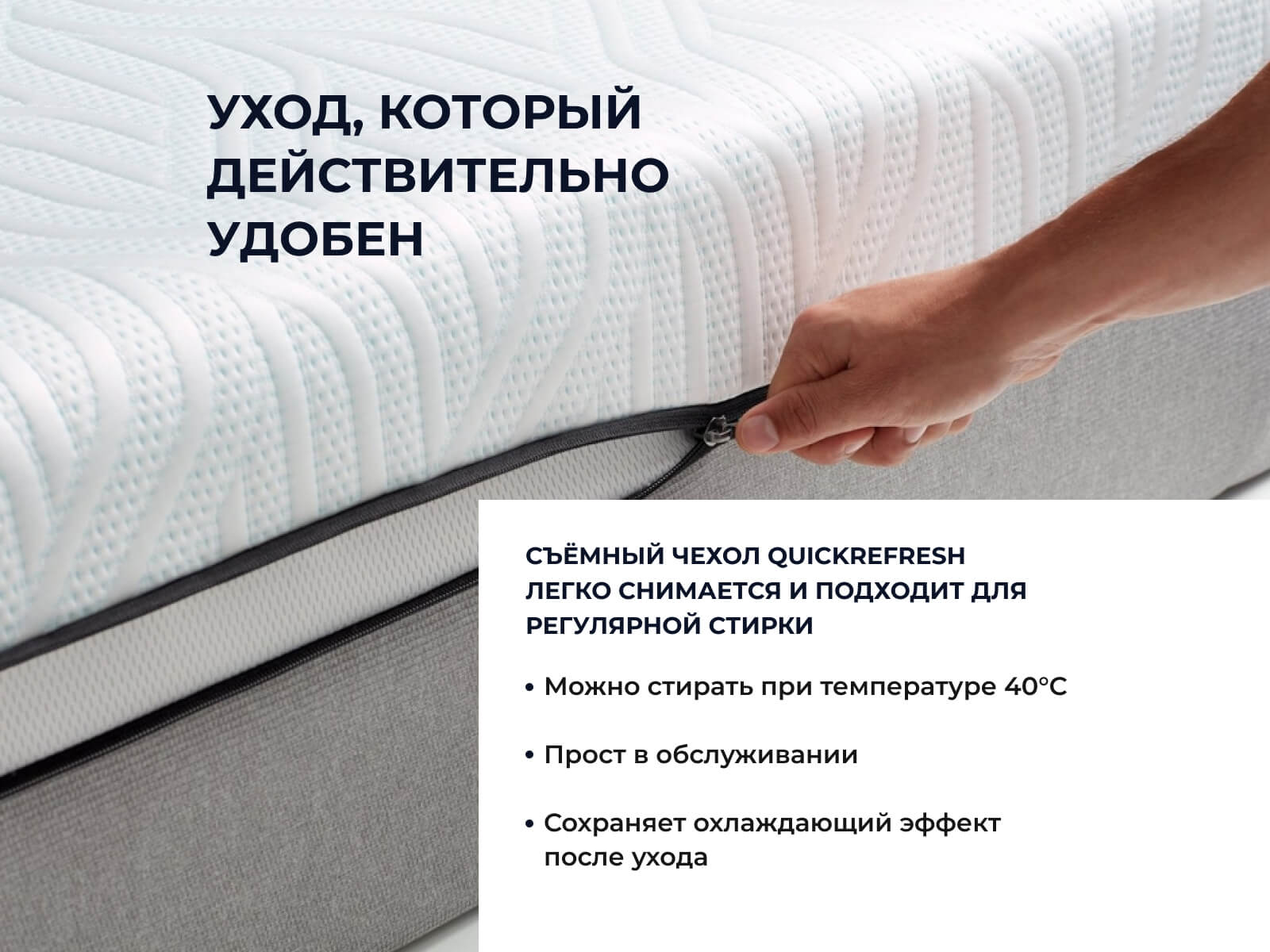 Инновационный материал TEMPUR® AdvancedВ основе матраса — передовой материал TEMPUR® Advanced, разработанный компанией Tempur. Он реагирует на вес, форму и тепло тела, точно повторяя контуры фигуры и обеспечивая до 20% больше снятия давления по сравнению с предыдущими поколениями TEMPUR®.Миллиарды сверхчувствительных молекул равномерно распределяют нагрузку, помогая расслабить плечи, бёдра и поясницу. Материал также эффективно поглощает движения, снижая передачу колебаний — даже если партнёр часто переворачивается, ваш сон остаётся спокойным. TEMPUR® Advanced сочетает адаптивную поддержку, выраженный эффект памяти формы и улучшенную долговечность, создавая сбалансированное ощущение комфорта и стабильности на протяжении всей ночи. Высота 21 см — адаптивный комфорт и точная поддержка TEMPUR®![]() Матрас высотой 21 см обеспечивает сбалансированное сочетание комфорта и поддержки. Достаточный слой материала TEMPUR® позволяет телу мягко погружаться в поверхность, повторяя естественные изгибы позвоночника и равномерно распределяя нагрузку. Такой формат подойдёт тем, кто ценит фирменное ощущение TEMPUR® — с аккуратным погружением, стабильной поддержкой и выраженным снятием давления в области плеч, бёдер и поясницы. Чехол SmartCool — мгновенное ощущение прохлады![]() Съёмный чехол SmartCool создан для тех, кому важно сохранять комфортную температуру во время сна. Технология SmartCool встроена непосредственно в волокна ткани, благодаря чему поверхность ощущается прохладной при касании и естественным образом поглощает избыточное тепло тела. Охлаждающий эффект не основан на химических пропитках — он сохраняется на протяжении всего срока службы и не исчезает после стирок. Чехол легко снимается благодаря системе QuickRefresh и подходит для машинной стирки при 40 °C, помогая поддерживать свежесть и гигиену матраса каждый день. Soft — мягкое ощущение с адаптивной поддержкой![]() Матрас с уровнем жёсткости Soft создаёт выраженно мягкое и обволакивающее ощущение. Материал TEMPUR® точно подстраивается под форму тела, позволяя плечам и бёдрам глубже погружаться в поверхность и снижая давление на чувствительные зоны. Такой вариант подойдёт тем, кто любит ощущение уюта и лёгкого “утопания” в матрасе, сохраняя при этом стабильную поддержку позвоночника и комфортное положение тела во время сна. Состав матраса TEMPUR PRO Soft![]() Верхний слой: мягкий TEMPUR Advanced APR-08 толщиной 3 см Самый мягкий вариант верхнего слоя в базовой высоте. Обеспечивает деликатную адаптацию под тело и первичное снятие давления без глубокого погружения. Комфортный слой: мягкий TEMPUR Adapt C60-08 толщиной 5 см Усиливает эффект памяти формы и глубину адаптации, помогая равномерно распределять нагрузку и поддерживать расслабленное положение тела. Основа: 2 слоя DuraBase HY25 PROF толщиной по 6,5 см Профилированный слой, который делает конструкцию более гибкой, помогает матрасу точнее подстраиваться под тело и улучшает циркуляцию воздуха внутри. Минимальная передача движений — спокойный сон для двоихМатериал TEMPUR® эффективно поглощает движения и снижает передачу колебаний по поверхности матраса. Если второй человек на кровати меняет положение или встаёт, эти движения практически не ощущаются с другой стороны.Благодаря адаптивной структуре TEMPUR® нагрузка локализуется в точке давления и не распространяется по всей поверхности матраса. Это по