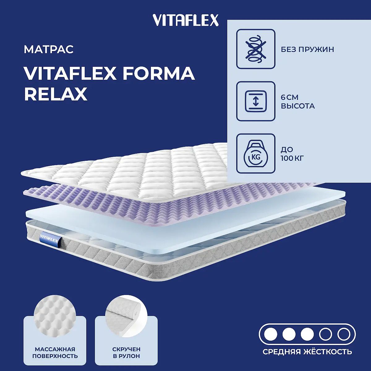 Матрас-топпер Vitaflex Forma Relax — это беспружинный матрас средней жесткости, созданный для дополнительного комфорта и поддержки вашего сна. Высота матраса составляет 6 см, что позволяет использовать его как самостоятельное спальное место или как дополнительный слой для коррекции поверхности кровати или дивана. В основе используется современный материал с рельефной резкой RelaxFoam толщиной 3 см и слой высокоэластичного пенополиуретана (ППУ) также 3 см. Такая комбинация обеспечивает приятную упругость, мягкую поддержку и равномерное распределение нагрузки на тело. Рельефная поверхность RelaxFoam создает легкий массажный эффект, способствуя расслаблению мышц и более глубокому отдыху. Чехол выполнен из мягкого трикота с аккуратной стёжкой на синтепоне (100 г) и бурлетом серого цвета. Трикотаж приятен на ощупь, хорошо пропускает воздух и сохраняет аккуратный внешний вид даже при ежедневном использовании. Характеристики